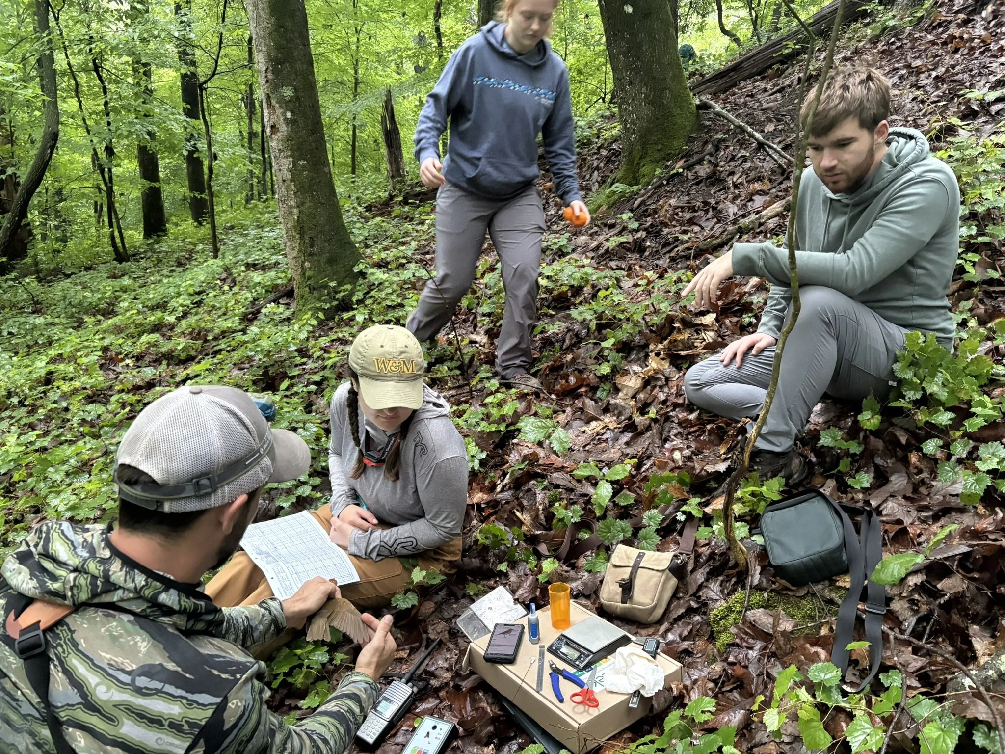 On wood thrush tagging days, our field team stealthily entered specific pockets of TRGT property, which were pre-surveyed for wood thrush use, just before dawn. Once at an ideal location, our interns helped set up mist nets and the banding/tagging station on the forest floor. From there, it was a waiting game where each of us monitored the net at different viewpoints and signaled whenever a bird was caught. We then processed, banded, and tagged the birds while our interns recorded data regarding the bird’s morphology, physical condition, and surrounding environmental variables. Throughout the tagging process, our interns gained valuable, hands-on experience in biological field research, learned about the importance of monitoring migratory pathways and habitat use for a declining songbird, and contributed to a long-term dataset that helps inform regional conservation strategies.