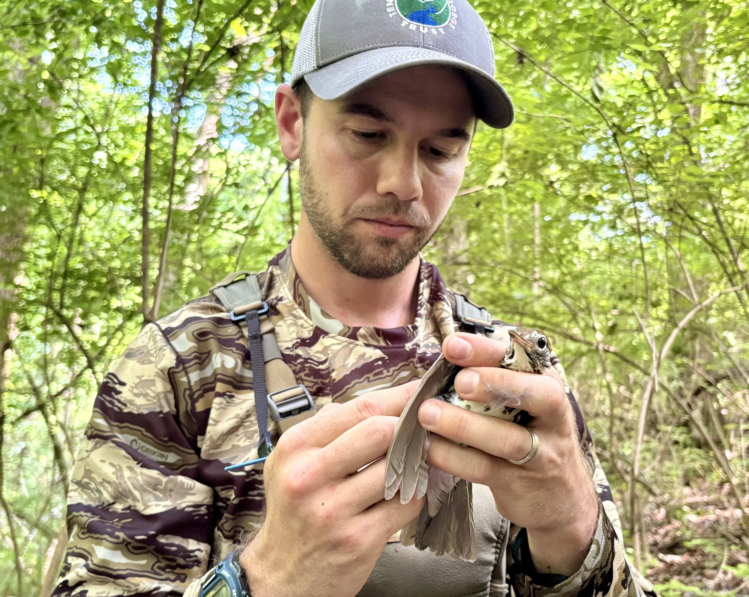 The author attaching a radio transmitter to the specific Wood Thrush that we (barely) outsmarted! Photo Credit: Robert Windham