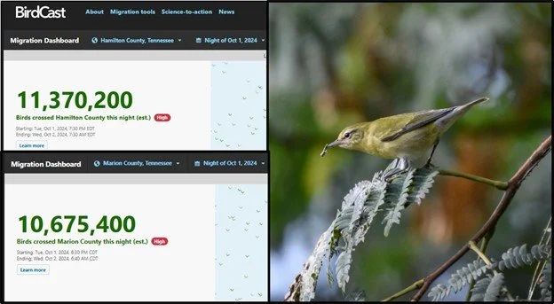 When Hurricane Helene ripped through the southeastern United States in the autumn of 2024, millions of passerine birds were holding tight to the north, waiting for the storm to pass before continuing their southward migration. On October 1, 2024—two days after the hurricane moved through—thousands of passerines appeared to quite literally drop out of the sky into the Tennessee River Gorge and surrounding areas to rest and forage. Here is a great example of just one bird list—complete with many photos of birds in flight—that captures just how many individuals birds were present at the time: click here to see the list.