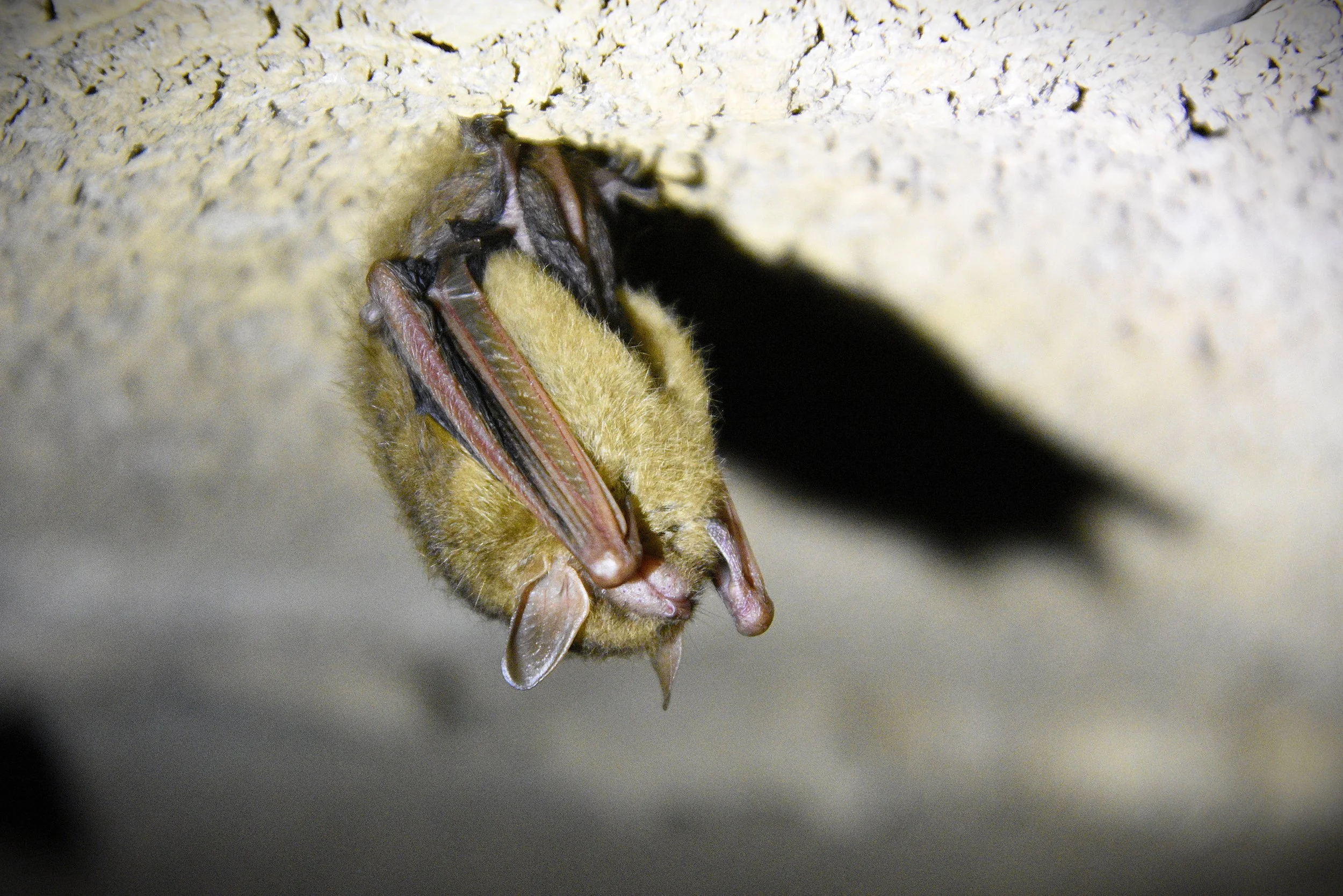 Federally-endangered Tricolored Bat in hibernation mode deep in a cave. Photo Credit: Austin Young