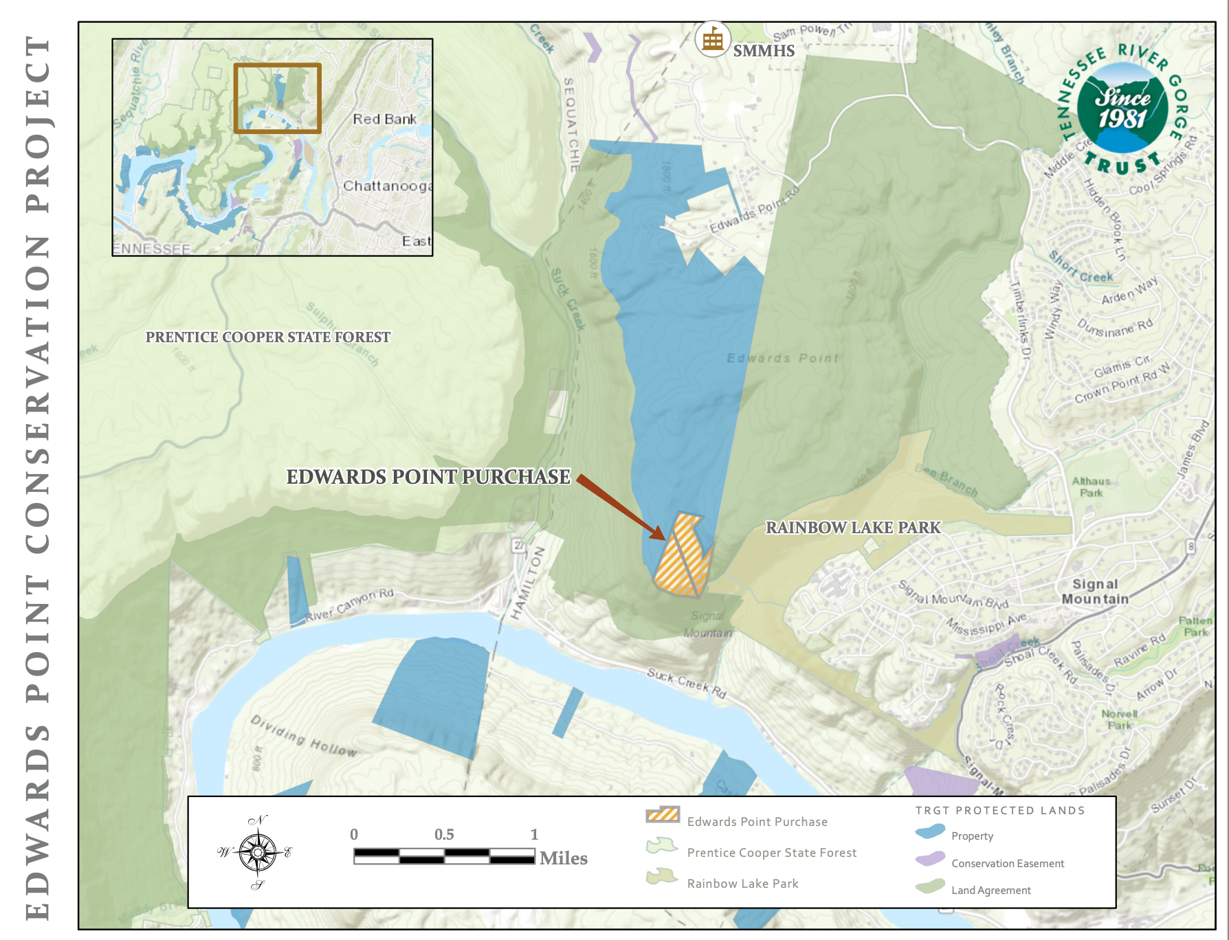 In 2022, TRGT purchased Edwards Point atop Signal Mountain in Chattanooga. Edwards Point was a gap in an extensive conservation landscape of protected properties. With this land acquisition, TRGT along with the Prentice Cooper State Forest and the Town of Signal Mountain now protect an area that spans miles from Middle Creek and Signal Point to Suck Creek. The Cumberland Trail, which travels right past Edwards Point, now has secure and permanent public access to the area. An array of ephemeral pools used by amphibian and reptile species can now be managed through informed science-based stewardship. The list goes on, but above all else, we are grateful and proud to say that this open space will remain in its wild state for generations to come.